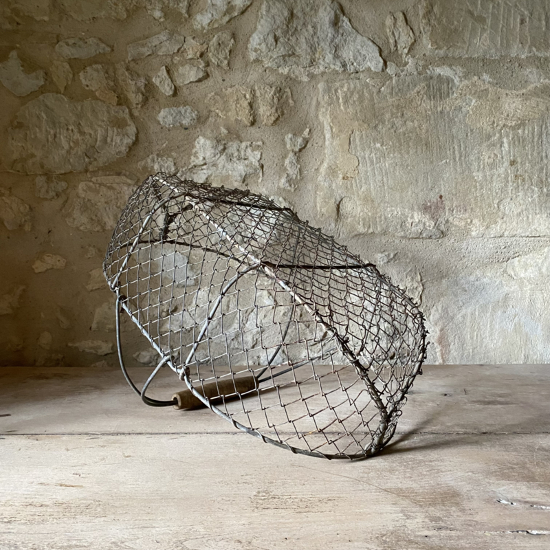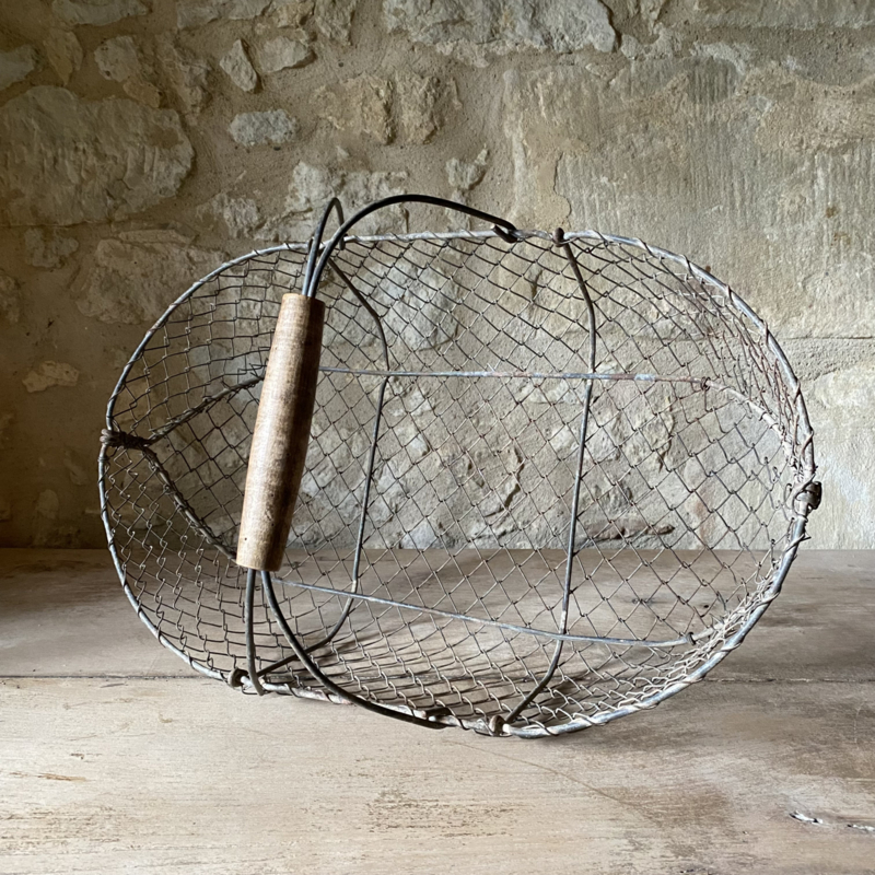 BU20110182 Old French wire mesh harvest basket with wooden handle in beautiful weathered condition, see photos for details. Size: 52.5 cm long / 15.5 cm high (to handle) / 28.5 cm high (including handle) / 32.5 cm cross section.