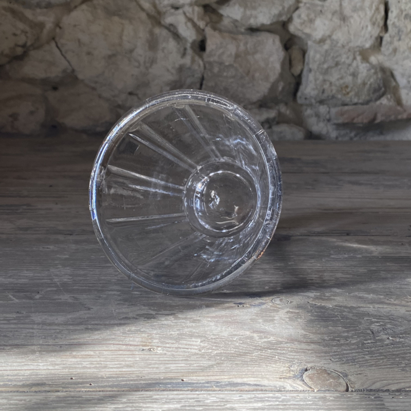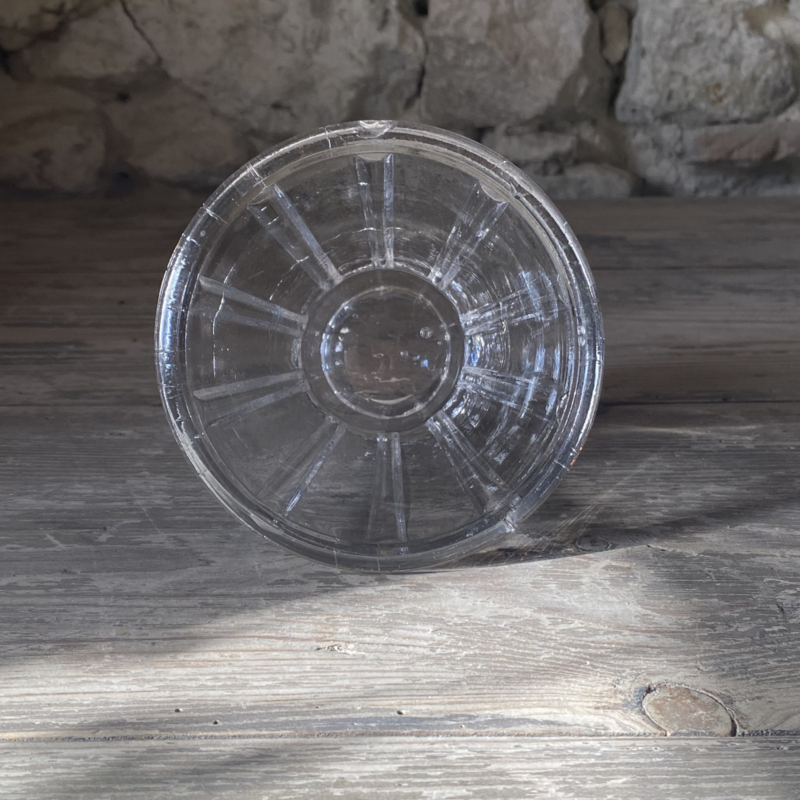 OV20111083 Antique French confiture jar made of mouth-blown glass. A small irregularity on the edge, see photo for details, otherwise in beautiful condition! Size: 9 cm high / +/- 11.5 cm cross section