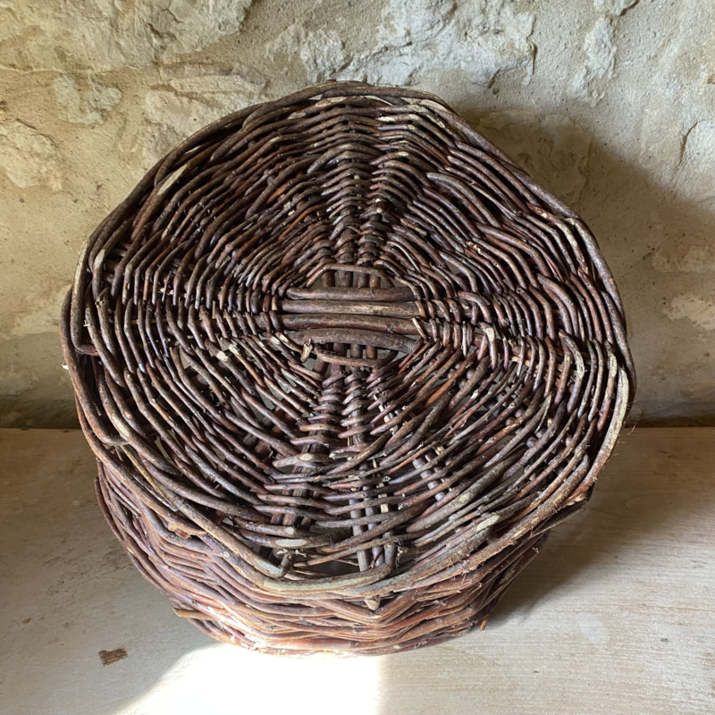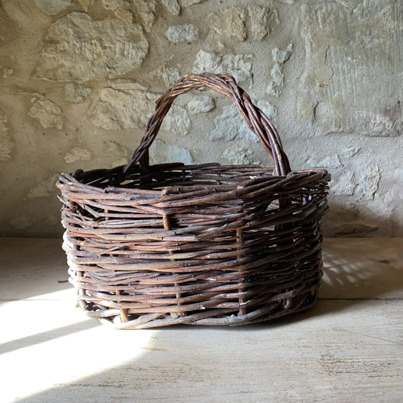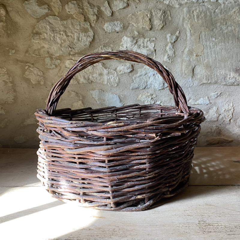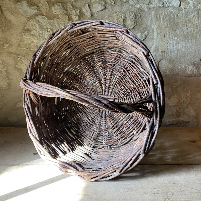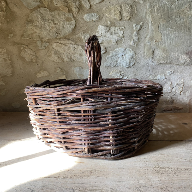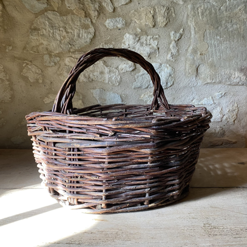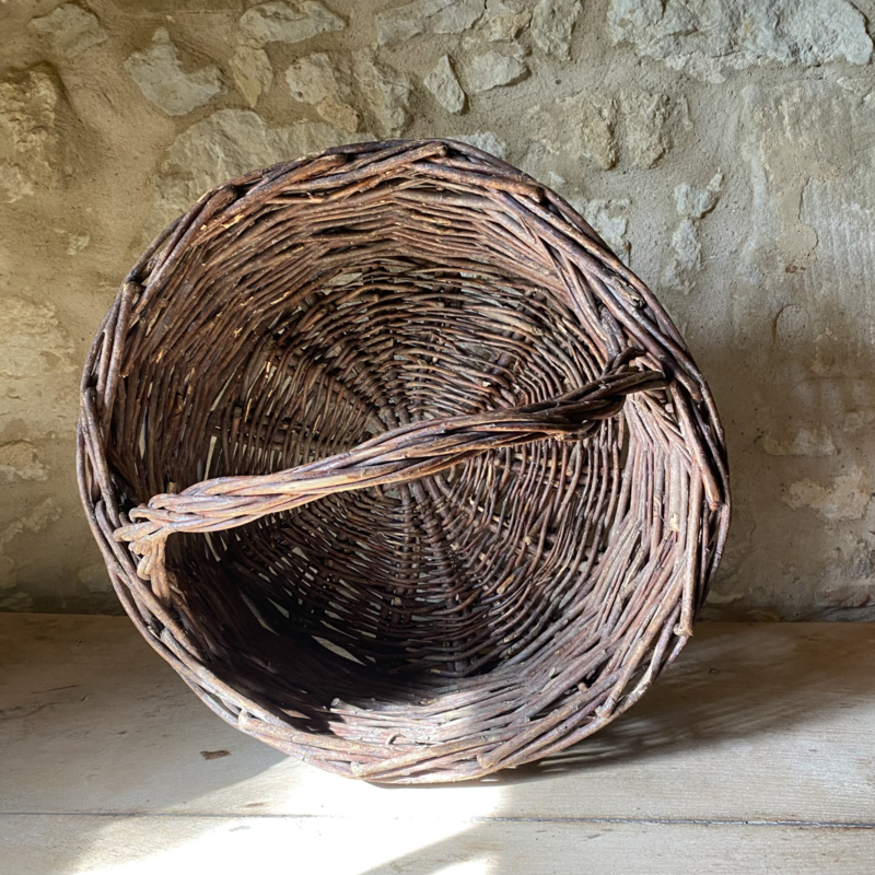 BU20110188 Old French rustic fruit harvest basket made of woven wicker in beautiful condition! Size: 18.5 cm high (to handle) / 32 cm high (including handle) / 41 cm cross section.